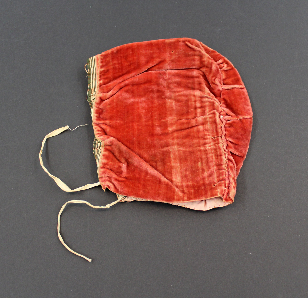 Red silk velvet child's bonnet; striped ribbon along front; gathered seam at center back