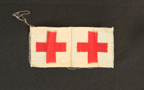 Rectangular red cross patch. Patch is made of white linen. Two crosses are embroidered in red on patch.