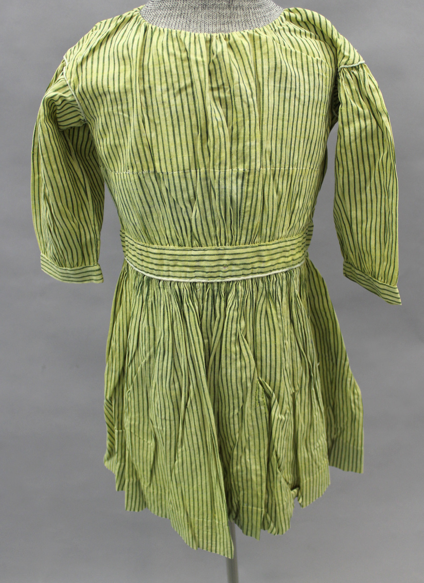 Lime green cotton child's dress with dark green woven stripes; long sleeves with cuff; scoop neckline with drawstrings; gathered front and back bodice; waistband with center back button and pink cotton printed floral design lining; piping at waistband and armholes; center back opening with brown and white glass buttons closure