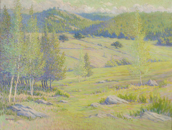 Oil on canvas landscape painting entitled "Summer Haze" OPen landscape with cluster of trees in left foreground, scattered rock outcroppings. Label on back reads "Painted on road from Torrington to Norfolk." Signed lower left "ADELAIDE DEMING"