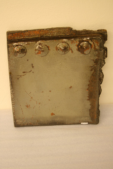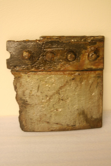 Section, or fragment, of the original Litchfield water tank. The fragment is extremely heavy. This fragment has uneven, ragged edges. Two-thirds of the fragment is composed of one piece of steel. The remaining third is a seperate section of steel that has been riveted to the first, to create a sealed overlap. Four bolt, or rivet, heads and backs are visible. The tank was painted gray inside and outside at some point, probably to seal the steel. Some old areas of rust are visible. This fragment was varnished at some point before it came to the museum, probably to prevent deterioration.