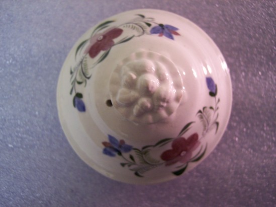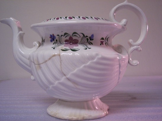 Large bodies teapot. Base (A) is slip molded in shell form with painted polychrome floral design. Rococo base with double C-scroll handle. Lid (B) is small and domed with knob of seashells