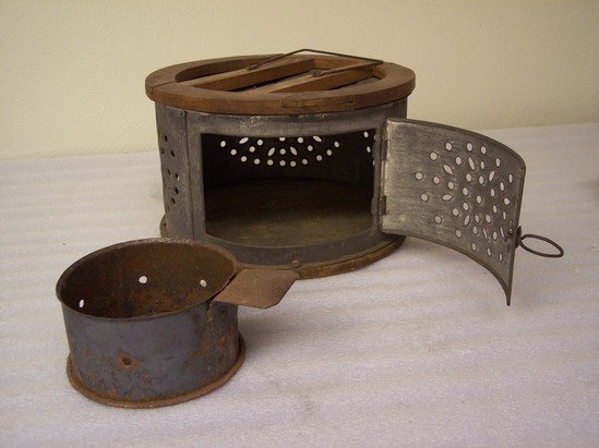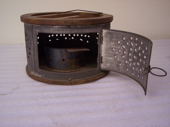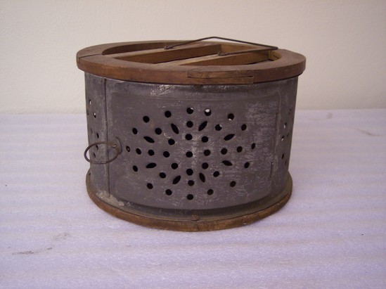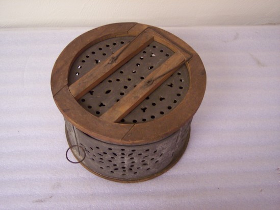 Round foot warmer. Wooden frame fitted with punched tin. Door has round bole handle. Round tin container to hold coals inside of foot warmer. Seams soldered, edges turned.
