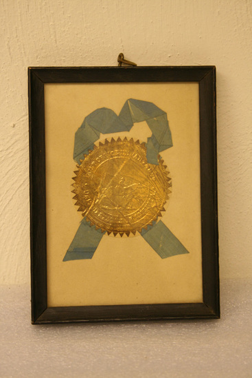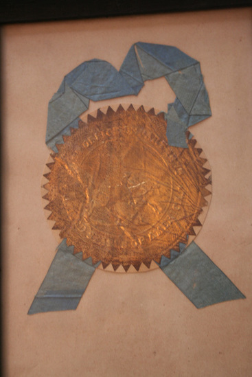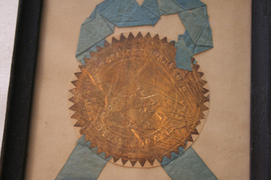 Gold seal with blue ribbon - image of man riding a horse in center. Seal of United States Post Office. Seal glued to white piece of paper - framed in black wooden frame. Brass circular hook at top to hang.