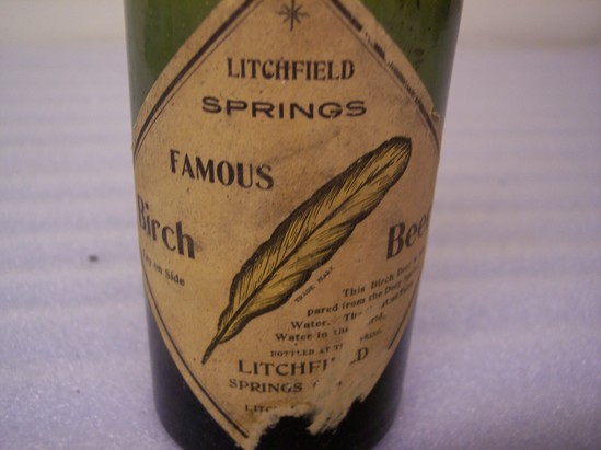 Crown cork bottle, round with long neck. Olive green glass. No visible seams. Paper label. Trade mark a feather. On it embossed "Litchfield Springs Famous Birch Beer, etc."
