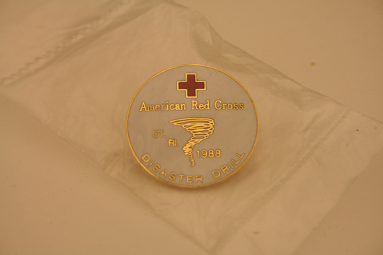 Clear plastic bag, sealed on all four sides. Inside contains round, metal American Red Cross pin. Gold metal on back, white on front. Red Cross outlined in gold at top of pin, "American Red Cross" in gold lettering underneath cross. Gold tornado in middle of pin with words "CT" "RI" and "1988" written around tornado. "Disaster Drill" written in gold lettering along bottom of pin. Stick pin with clasp on back.