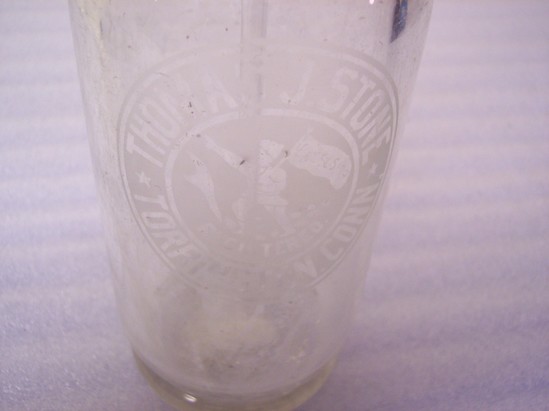 Glass seltzer bottle - cylindrical body. Metal top with spout and squeeze handle. Glass tube extending from interior of spout down into bottle. Front of bottle has seal with male figure carrying flag pointing to the left. "Thomas Stone/Torrington, Conn" surrounds image in a circle
