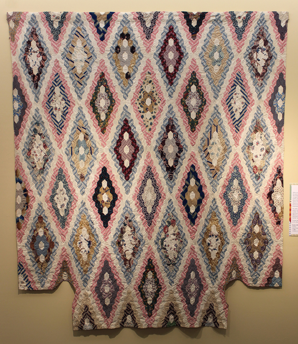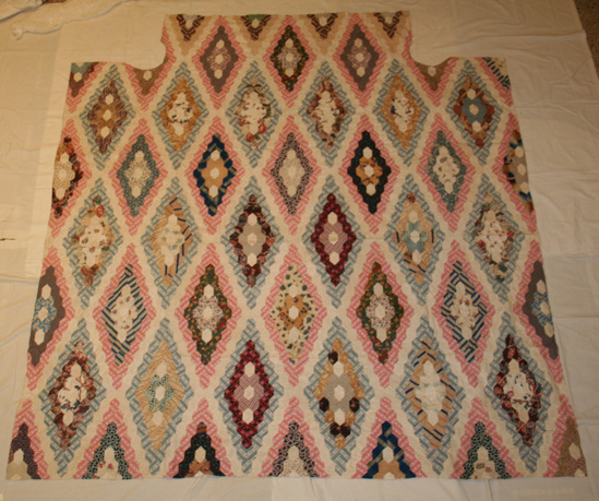 Patchwork quilt top, small hexagonal or honeycomb patches forming large diamonds, set off by single row white muslin hexagons. Pattern is a variation of the Diamond Field or Field of Diamonds. Cut-out corners on one edge, to fit a four-poster bed. Colored fabric consists of variety of early 19th-century block and roller printed examples.