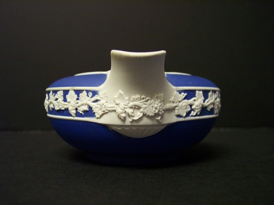 Blue jasperware dip with white sprigged-on decoration of grape leaves. Matches 1911-20-1. Stamped "Wedgwood" and "R.K." on the bottom.