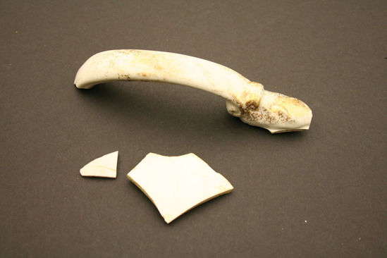 3 pieces; one is part of handle, large with gold paint on outer side; two other small pieces, both with gold paint