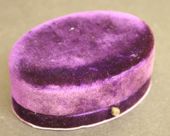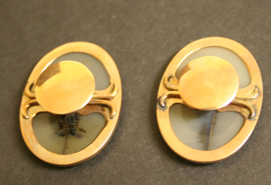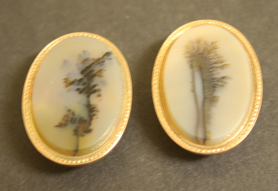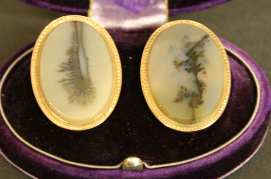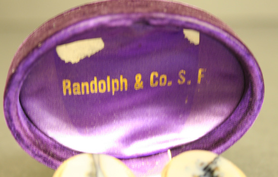 Pair of oval shaped white moss agate cuff links with round gold collar and mushroom shaped shank on back. Irregular design down center of each cuff link. Cuff links contained in a purple velvet oval box with hinged lid. Interior lined with purple silk on lid and purple velvet on base. Brass push button catch. "Randolph & Co." printed in gold in inside of lid.