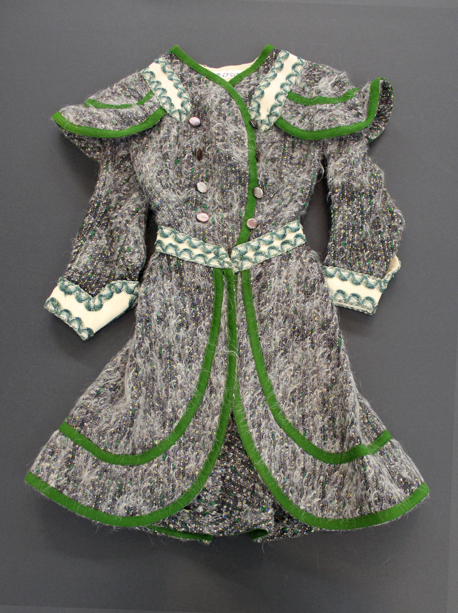 Gray wool tweed child's coat; double-breasted opening with mother-of-pearl buttons; shoulder cape; A-line skirt with box pleat at center back; green felt trim with off-white silk with green scalloped trim at shoulders, waistband and cuffs; top half partially lined