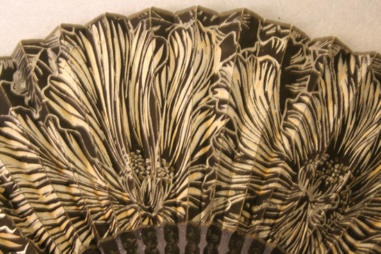 Black wooded frame and supports with silver decoration. Fan opens to show large silver flowers with peach highlights.