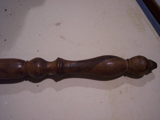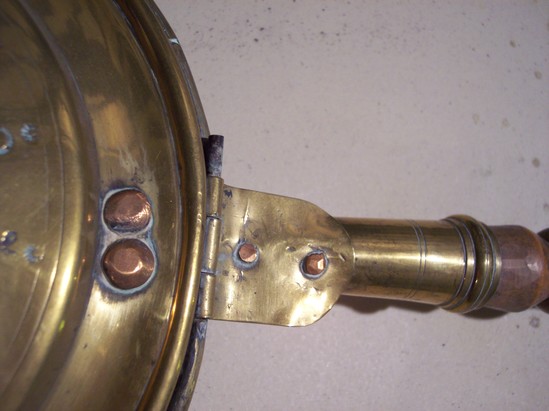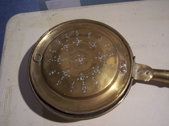 Brass pan with straight sides, 3/4" flat rim with rolled edge. Eight holes in circular arrangement on top with geometric engraving. Ring pull opposite hinge. Turned wooden handle, with faux grain.