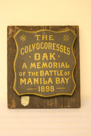 Square piece of wood painted dark green, shaped, shield like, piece of wood mounted on top. Also painted green with gold border. Painted in gold lettering "The/Colvocoresses/Oak/A Memorial/of the Battle of/Manila Bay/1898"