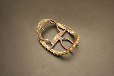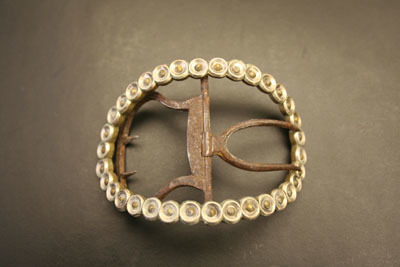 Pair of shoe buckles. Oval shape with rounded body. Face of buckle composed of chair of silver circles with brass pin riveted in cented of each circle. Center rod with two tongues. One is U shaped with two long thin prongs. Other tongue has rounded body with two small prongs pointed towards center rod