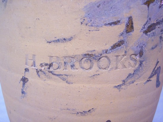 Redware pottery crock with glazed interior. Stamped "HBROOKS" on side of crock
