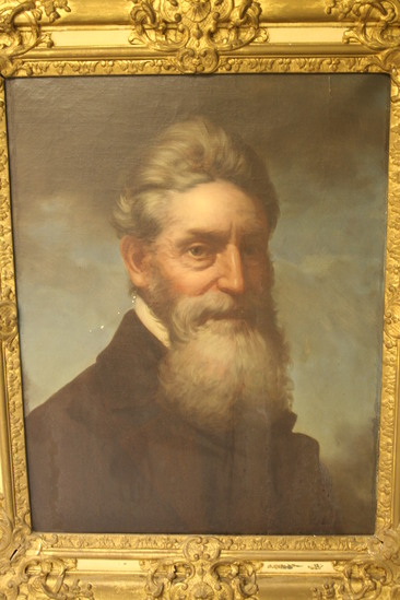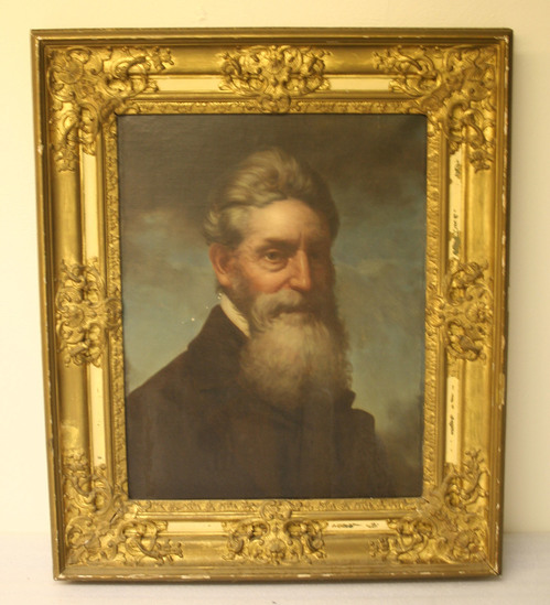 Oil painting of John Brown. Head and upper torso. He faces right. Older man with full beard and thick grey hair pushed back off head. Brown eyes. Dark suit, white shirt collar visible. Dark blue background. Wooden frame with plaster decoration, gilded.