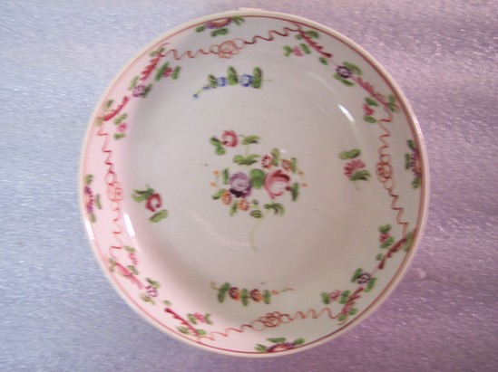 Saucer is decorated with garlands of flowers in polychrome and overglazed on the exterior. Single flower in the center.