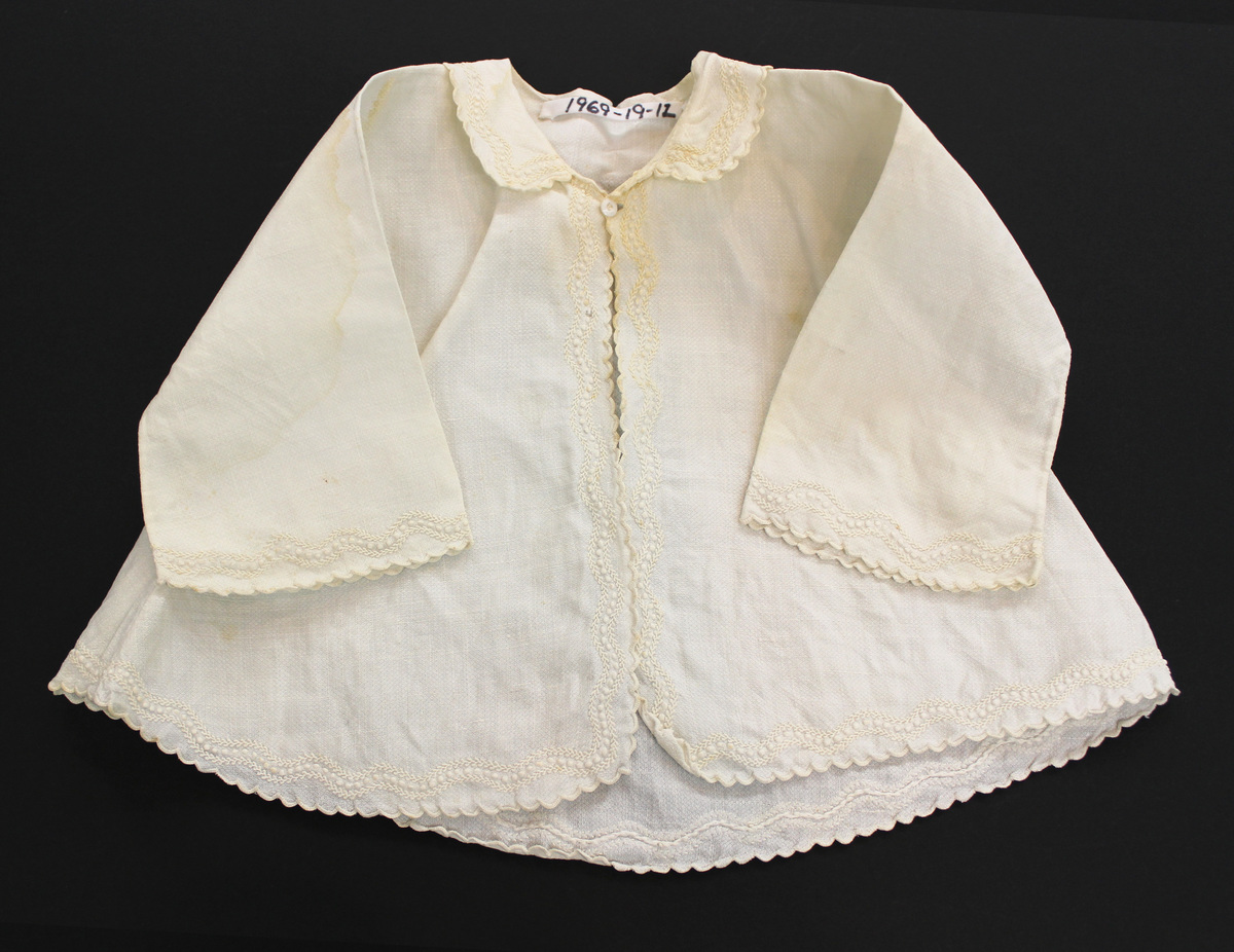 White linen child's jacket; kimono style; round collar; long flared sleeves; center front opening with glass button closure; embroidery on collar, sleeves and hem