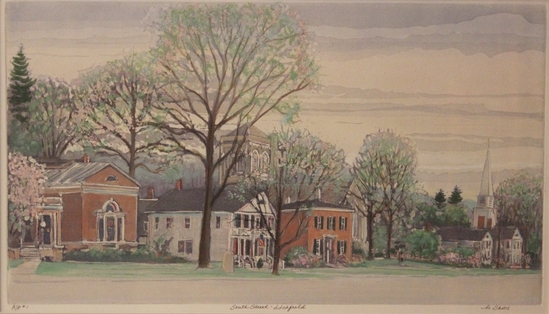 Pen and watercolor drawing with view of South Street, Litchfield, CT which includes all buildings from the Litchfield Historic Society (on left corner) to the Catholic Church. Framed in gold tone metal frame. Marked along bottom of image: "A/" #1, South Street, Litchfield, M. Davis"