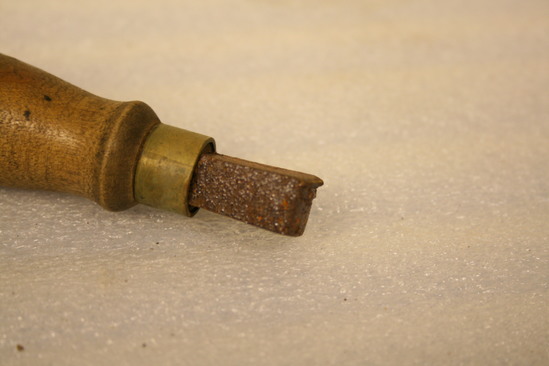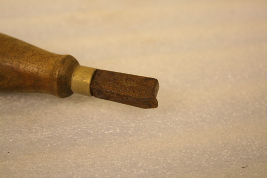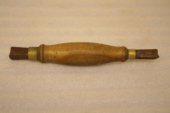 Cobbler's tool, wooden handle in center with iron bits on each end. Brass ring at end of each bit by wooden handle. Bits are rectangular in shape with one edge slightly raised. One bit thicker and shorter than the other.