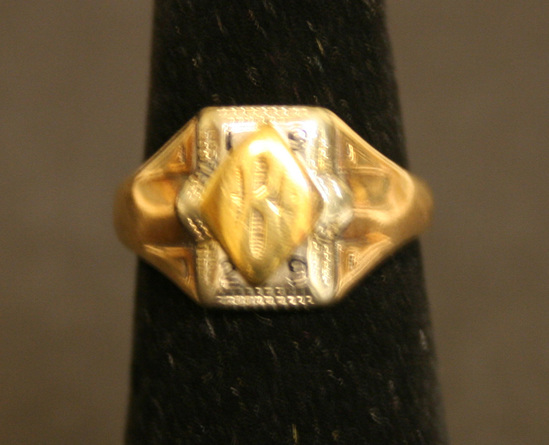 Gold class ring - gold band. Face of ring has silver square in center with a diamond shaped gold piece centered on top of square. In each corner of silver square is a single number "1", "9", "2" and "9". Diamond shape in middle inscribed "HBS" Small gold ring attached to ring - probably worn on charm bracelet at one point. Donated in black velvet ring box - probably not original to ring.