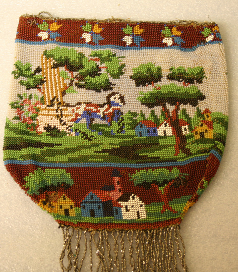 Beaded bag with silver beaded looped fringe on bottom. Top band, 3/4" stylized flower design. Central band, 3 1/8", scene of houses, trees, horse. Bottom band, 1 3/4" w., small houses with red/rust background.