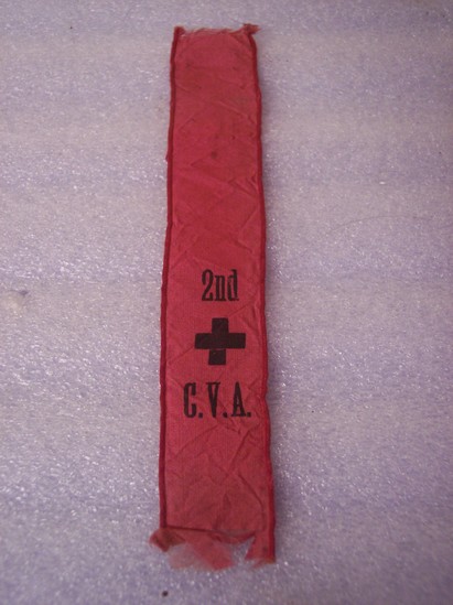 G.A.R red silk ribbon badge. Two short ends frayed, two long ends have seams. Printed in black on lower half of ribbon "2nd / (image of black cross) / C.V.A."