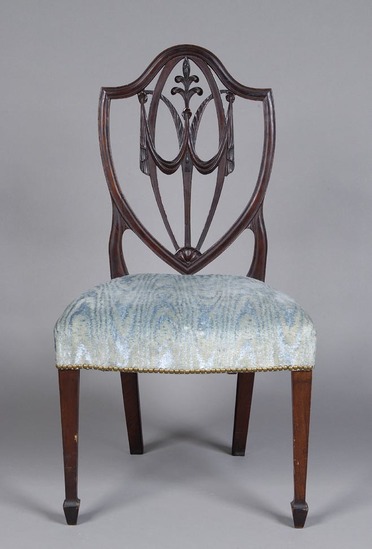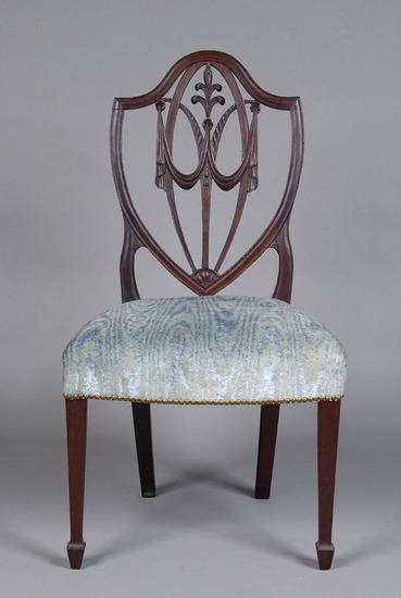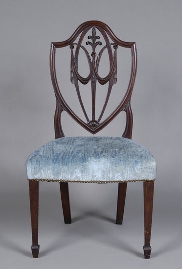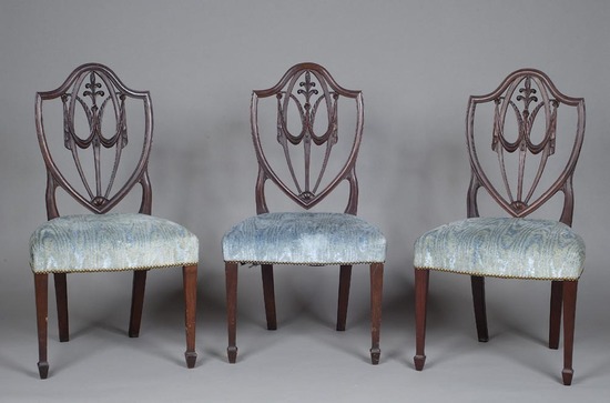 Three Sheraton style shield back side chairs. Upholstered seat in light blue velvet - not original. Upholstered tacked down on side with brass tacks. Shield shaped splat with Prince of Whales feather motif surmounting swags, 1/4 rosette at base of shield. Square tapered legs with spade feet. Plain rear legs.