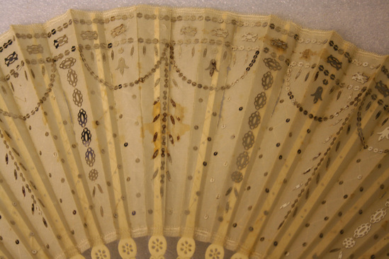 Fan with ivory sticks with carved motif and silver dots inset into invory. Body of fan made of white net field with silver spangles in formal classical design. Silver pin and handle with ivory knob.