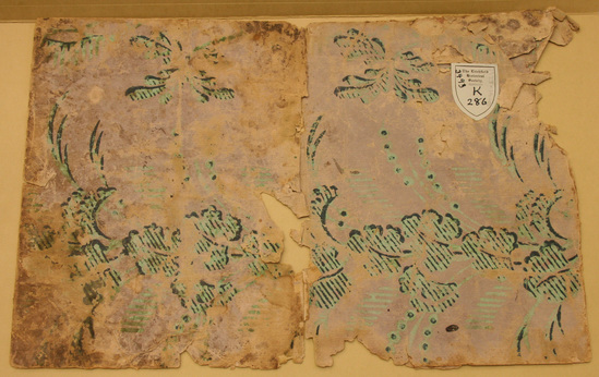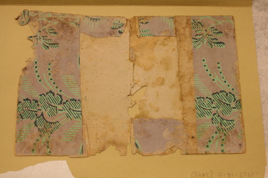 Wallpaper fragment, used as the cover for Sarah Beekman's Litchfield Female Academy Diary of 1807, in the LHS Mss. Collection. Block print paper of lavender ground with leaf pattern printed in two blocks, paris green with lines and contours in black.