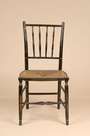 Black painted wooden chair with rush seat. Sheraton style, with bowfront rails and double round side stretchers. Curved top and bottom rails. Painted decoration, gilt, on front, back, and on front stretcher.