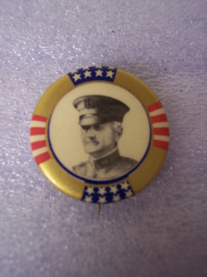 Round metal button. In center is black and white photo of a man in military uniform. Gold border around the outside of center image. Panels of blue stars above and below image of man, panels of red and white stripes on each side of image of man.