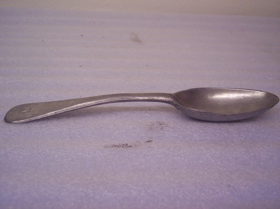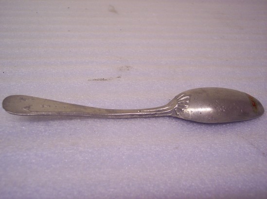 Deep oval bowl, roughly cast pewter spoon, "HIS" and cross on round end of handle, rayed joint and initial "A (and backwards R)" on back of handle