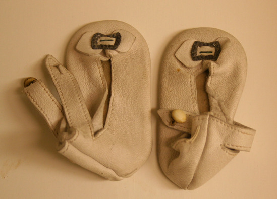 White kid Mary Jane doll shoes - paste buckle, strap around ankle with wooden button