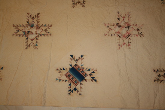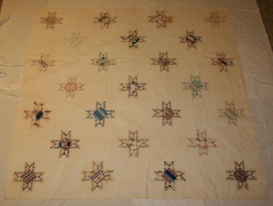 Patchwork, applique and quilted coverlet. Quilted white cotton with 3 rows of 4 by 3 rows of 3. 21 pieced appliques of roller printed cottons in blue, brown and pink. Appliques in Nine Patch Star design with Saw Tooth. Quilted in tulip, doves and geometric patterns.
