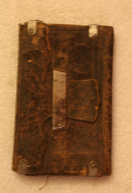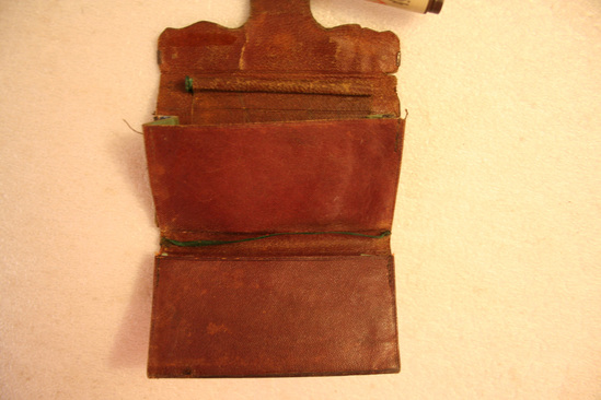 Black leather tri-fold wallet decorated with metal brackets. Leather flap through metal band to close. Cylindrical sleeve to hold pencil below flap. Two interior accordian style pockets. Green ribbon tied to wallet, stretching across space between two pockets.