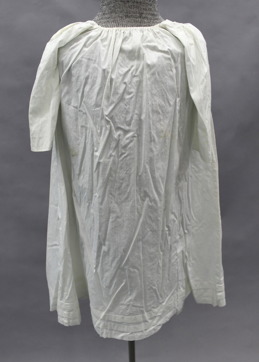 White cotton child's dress; scoop neckline; A-line; long straight sleeves; tucks at hem; short bodice in back; drawstrings at neck and center back