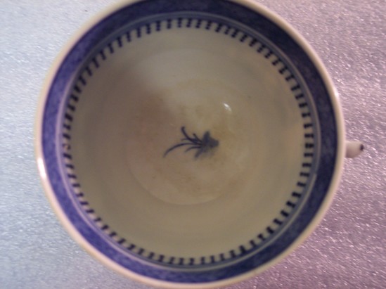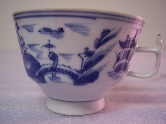 Round footed teacup. Blue and white. Handle is square with a long, raised thumb rest. This teacup has more decoration than the others. It has dots on the interior and on its handle.