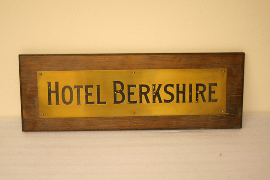Brass plaque with "HOTEL BERKSHIRE" incised into brass. Letter painted black. Brass mounted on piece of wood that is larger than brass.
