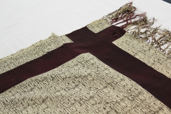 Large shawl - printed design on cream ground with heavy speckling of black dots; slightly larger maroon colored dots throughout; thick stripe of maroon along each edge; maroon and cream fringe on two sides