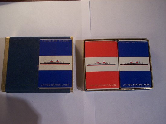 Two decks of cards. One has red background and other has blue. Printed across top in gold lettering "S.S. United States - S.S. America" and across bottom "United States Lines" white band in center with picture of large cruise ship. Decks housed in cardboard box covered with gold paper. Exterior lid slides over top of box. Lid covered in slate blue velvet with gold paper border. One blue playing card glued to surface of lid. Back of lid embossed with a gold eagle holding an olive branch in one claw and arrows in the other.
