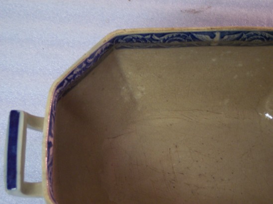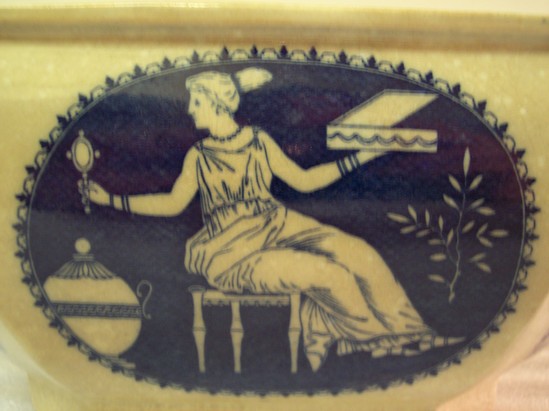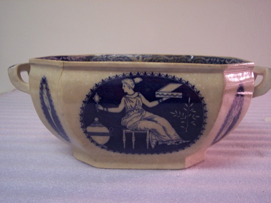 Lid is white with blue classical motifs. Central image is of a charioteer. Handle has a broad blue strip running lengthwise. Space for label. Base is white with blue classical motifs. Blue decorative edging lines the inside of the top rim. Two handles on either side both have a broad, blue stripe running their lengths. Base is severely discolored. Tureen matches platter with the number 1909-05-4.