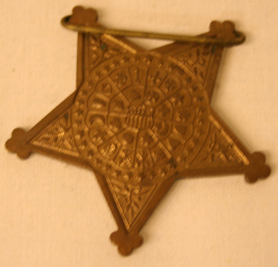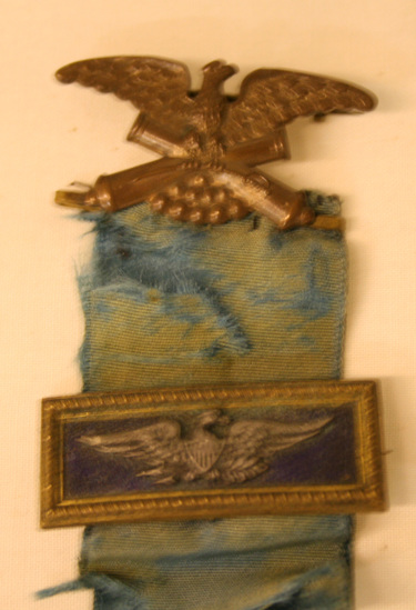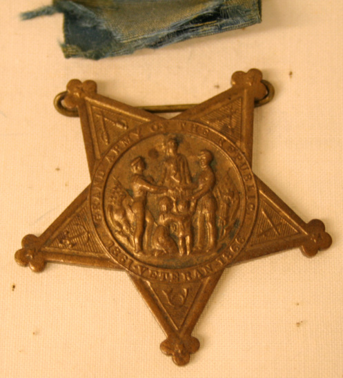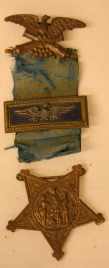Medal - brass pin bar at top. Ornament on top of pin bar of eagle with wings spread holding two crossed cannons in its claws. Attached to pin bar is blue silk ribbon. Half way down ribbon is another pin bar - rectangular with raised border. Center colored black with image of eagle with wings spread. Star shaped medal supposed to be attached to bottom. Imagery in each point of star, front has scene of two men shaking hands. Around scene "Grand Army of the Republic" and "1861 Veteran 1866" Back of medal covered with various symbols in a decorative design.