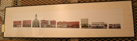 Each building on West St was individually photographed and then set in a line as they would appear on West Street. The line of buildings follows the natural slope of the street. All extraneous parts of the streets such as cars, trees, or streets signs have been removed to show only the building facades. Printed as a large photograph. Images are all in color. Framed under plastic with a simple black metal frame.