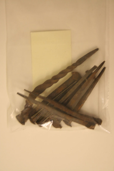 9 iron nails - 8 with straight body and 1 with twisted body like a screw. All have irregular rectangular shaped heads. Wrapped in paper envelope. Written on outside "Old handmade nails/taken from the walls/May 1923"
