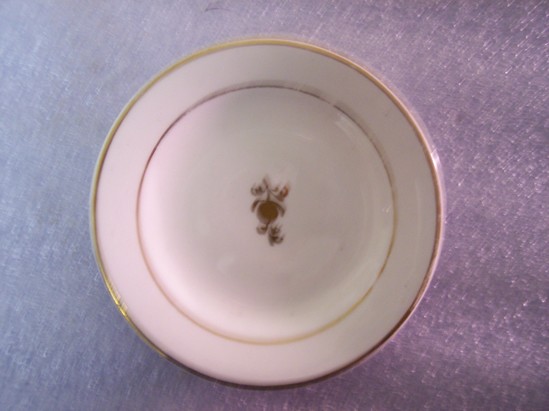 Small, white round plate with gilt line rim and inner circle. Small, gilt floral spray in the center of the plate. Wide foot rim.