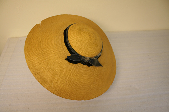 Large yellow straw bonnet - shallow top with wide brim. Two velvet ribbons, one blue and one black, around brim of hat with bow in back.