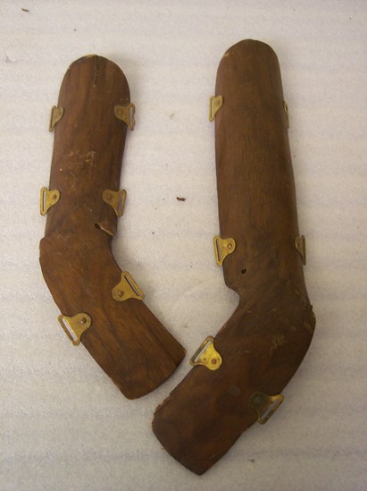 Pair of wooden splints. Splints curve at 70 degree angle in middle - to be worn on arm or foot? 6 brass rings on each piece. Wood varnished on outside. A slightly larger in size then B.